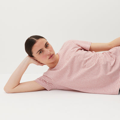 - Pour la version rayée, la filature est "open end" : une technique inventée dans les années 70 et qui enchevêtre solidement les fibres entre elles. On obtient un toucher et un grain un peu irrégulier, comme sur les beaux t-shirts qu’on trouve en vintage.