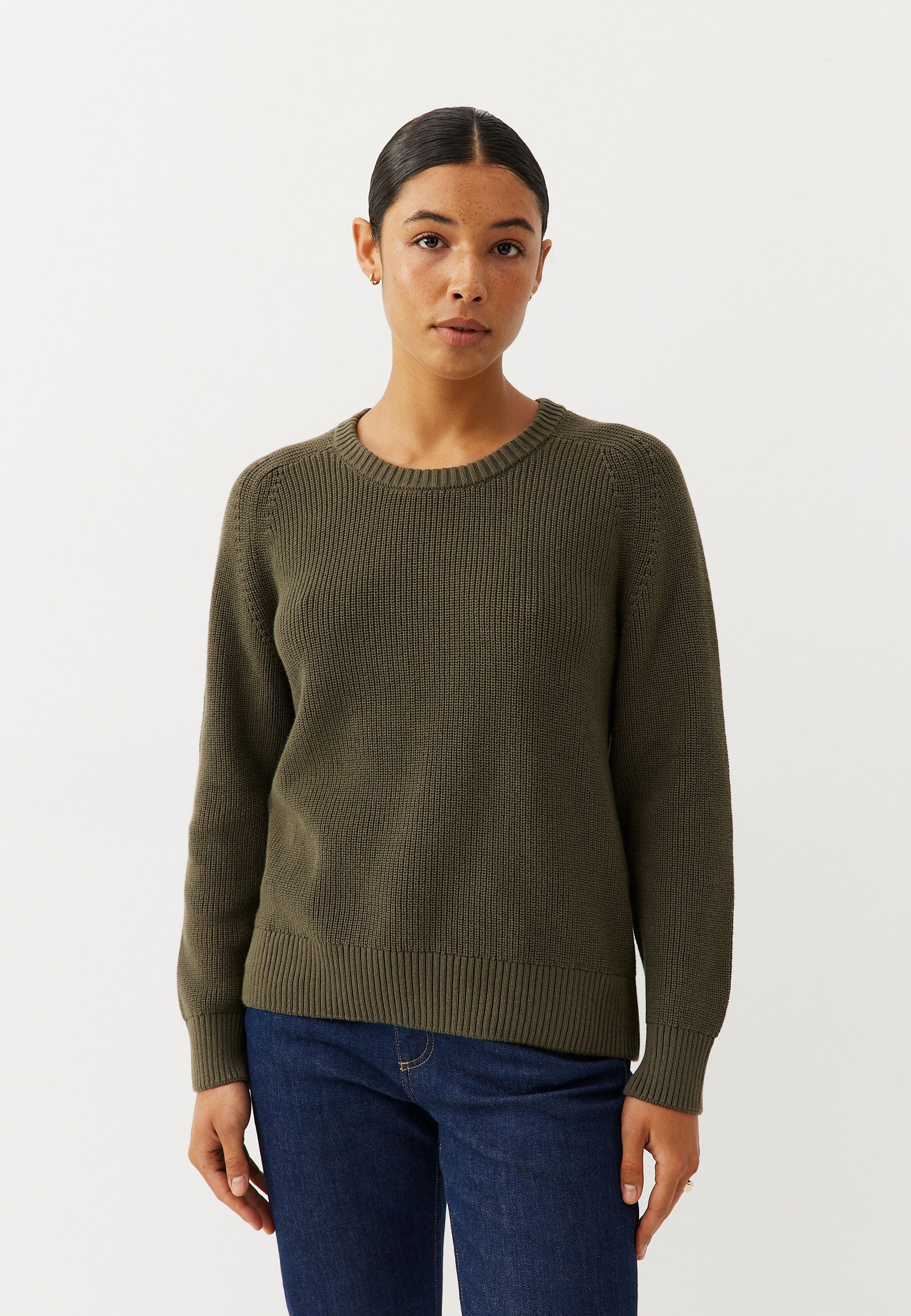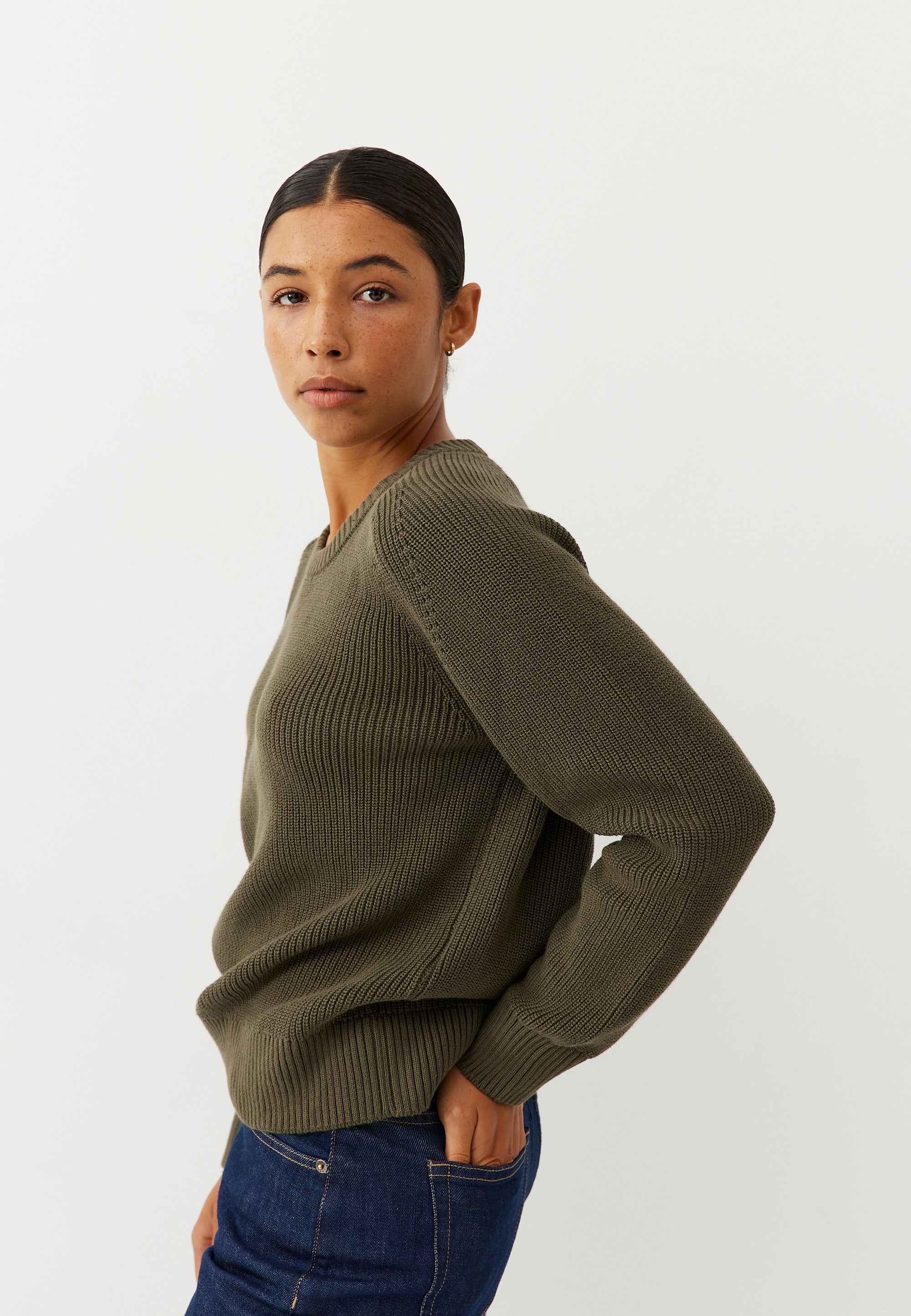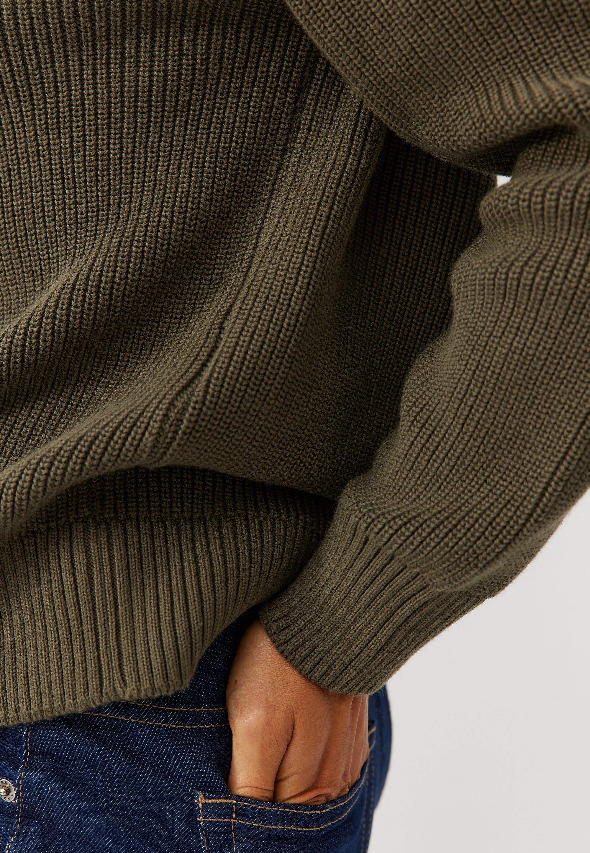 Les beaux pulls sont souvent en laine – ils tiennent chauds mais sont assez fragiles : accrocs, mites, bouloches ou machine à laver qui fait perdre 3 tailles, les risques ne manquent pas. En choisissant de le tricoter dans un beau fil de coton bio pour la mi-saison, on en fait un produit aussi beau mais plus robuste. Comme le coton se détend plus que la laine, on a renforcé les manches avec de l’élasthane pour qu’elles ne vous lâchent pas les poignets. Et comme d’habitude, on l’a prélavé, pour ne pas qu’il rétrécisse chez vous.