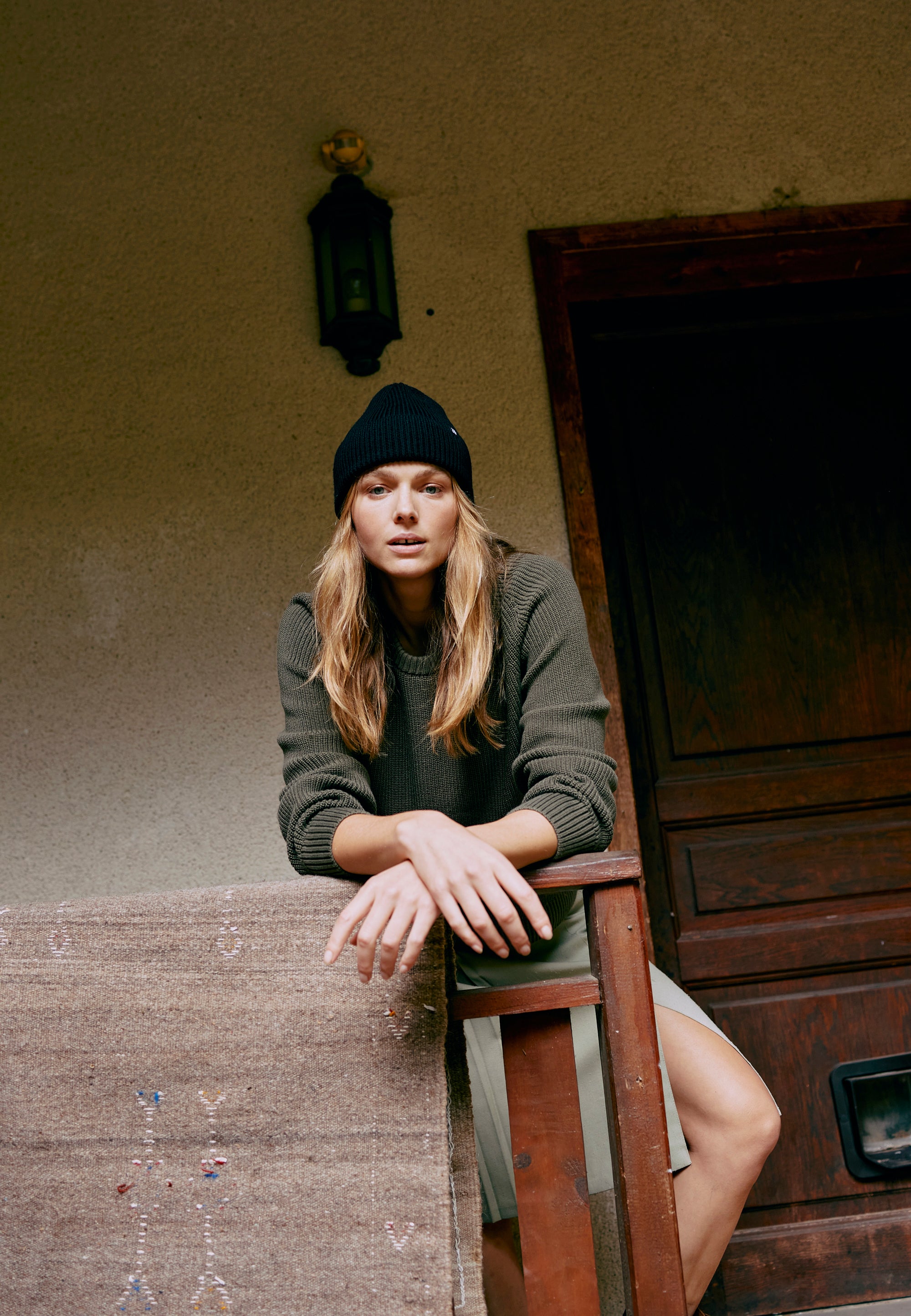 C’est la première génération de ce pull mais on ne part pas de zéro. On a fait un autre pull en relief, le “pull chaud” : il était très beau mais un peu fragile parce qu’en laine. Pour ce produit, on a choisi du coton, plus résistant à l’abrasion et lavable en machine. Pour la coupe, on a repris celle de notre pull chaud : cela fait plusieurs années qu’on l’ajuste, on sait qu’elle convient à la plupart d’entre vous.