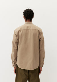 La base d’une bonne surchemise, c’est un tissu solide. Pour ça, on a été toquer à la porte de Telatex, une usine des Vosges née en 1840 qui fait (entre autres) du très beau workwear. Avec son twill dense, ses deux grosses poches à rabat et des coloris légèrement patinés, impossible d'avoir l'air guindé dans cette surchemise.