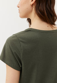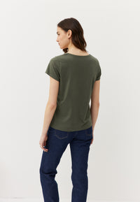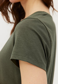 Recette de votre prochain t-shirt préféré : du Tencel (une fibre produite à partir de pulpe de bois) pour un toucher doux et un tombé fluide, du coton (bio) pour la tenue, un décolleté flatteur et des manches assez courtes pour un look féminin. Bonus : comme le Tencel est quasi-infroissable, votre look sera toujours impeccable, même si vous sortez du lit.